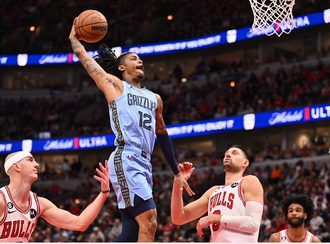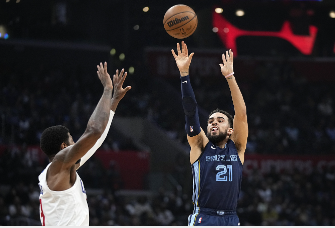 吉祥坊体育新闻:孟菲斯灰熊队的 Tyus Jones(#21)在对阵洛杉矶快船队的比赛中投篮