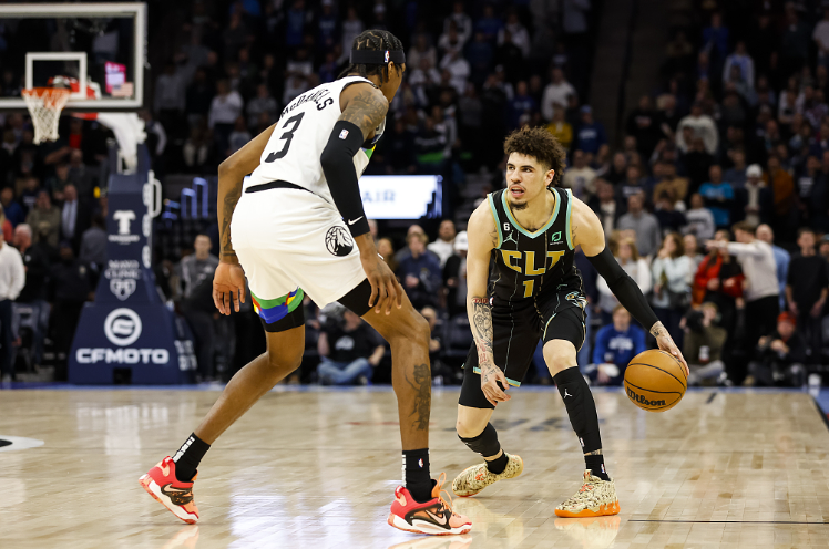 吉祥坊2023NBA:夏洛特黄蜂队的拉梅洛在对阵明尼苏达森林狼队的比赛中运球