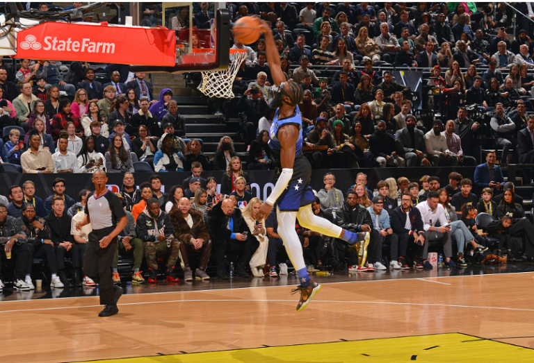 NBA 新闻:勒布朗的杰伦布朗在 NBA 全明星赛上扣吉祥坊篮扬尼斯